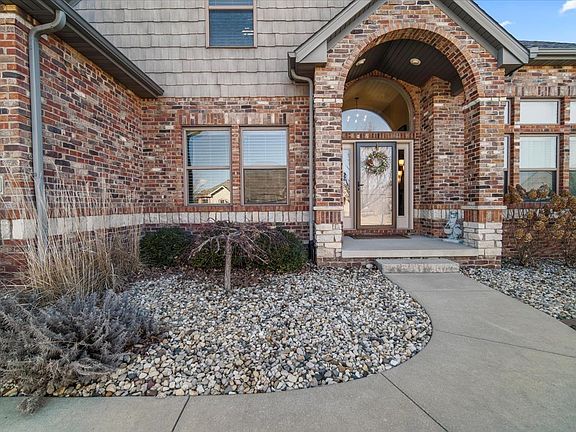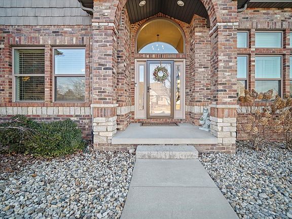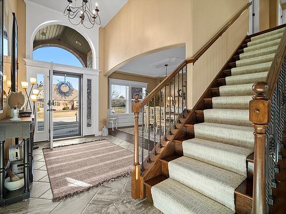This beautiful, East facing, home perfectly blends elegance with top-tier pride in ownership! Sitting on a larger, fenced, corner lot, this home greets you with an arched front porch design that leads into the welcoming foyer. Soaring 2-story ceilings flow into the living room where design is elevated with stacked clerestory windows creating a bright and airy atmosphere. The heart of this home is the extra-large kitchen, designed for both functionality and style. A trendy overhead beam marks the entrance, while a buffet area and breakfast bar that comfortably seats 4 makes hosting a breeze. There are even two ovens to put ease on your holiday cooking ventures. The dining room features an additional built-in buffet, offering versatility for toy storage in a play room or organizing office supplies. Off the garage is the beloved drop zone with lockers and laundry room. Retreat to the main floor master suite, adorned with a stunning wall of windows, tall double sinks and a closet outfitted with a custom closet system. Upstairs you'll find a second en-suite with vaulted ceilings, plus two more spacious bedrooms, and a 3rd full bathroom, ensuring ample space for all. The expansive 9' tall basement features a full wet-bar complete with a fridge, dishwasher and microwave. The wide-open living area boasts a 2nd fireplace, providing warmth and charm. Additionally, a 5th bedroom and 4th full bathroom are located in the basement, along with versatile flex room that can be a gym, theater or possible 6th bedroom. You'll also appreciate the storage room where all the metal racks and upright freezer are staying! Step outside to discover an extra-large patio area with distinct sitting areas perfect for enjoying evenings under the pergola, gathering around the fire pit, or shooting hoops on the brand new Goalrilla basketball hoop. With a wall of trees providing privacy, you will truly enjoy this backyard! Don't miss the irrigation system that will keep your grass looking perfect and the professional landscaping shining. Radon system already installed. Exterior security cameras will stay.