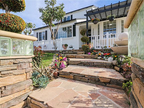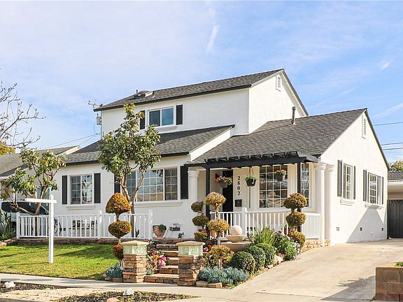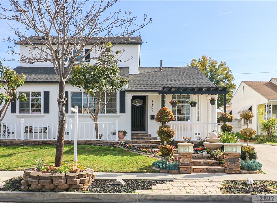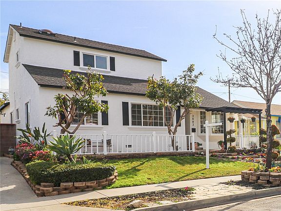 Introducing a one-of-a-kind Stunning, Updated, and Freshly painted Modern White exterior with black trim featuring shutters that brings to life an Urban Farmhouse feel located in the sought after Lakewood Mutuals neighborhood. 2-Story 1944 sq/ft of living space, an impressive 5 bedroom, 3 bath creating endless living and potential ADU possibilities. Up the custom natural stone steps, beautiful landscape, leads to a neighborly front porch pergola. Open floor plan concept, hardwood flooring throughout connecting formal dining area, spacious living room that extends to additional living space with a large bay window, which can be used as an office or converted into a bedroom. The high ceiling kitchen area has been extended and remodeled over time featuring Venetian Golden Granite Counter tops, Island Seating, Oak Cabinetry, Tile backsplash, Sunroof and Celeste windows for natural lighting, dual panel sliders, travertine tile, and a newly installed Sputnik Farmhouse Chandelier to compliment the black matte sink features. Spacious pantry aligns with washer and dryer hook ups. 1st Floor, has LED light fixtures and recess lighting, 2 bedrooms and a 3rd very spacious bedroom, a full bath with newly installed sliding shower door, and LX matte black high-pressure balancing shower head, and lastly a 3/4 bath towards the back of the home with newly installed entry door and trendy shower features. The Hardwood Staircase with Oak handrails leads to the private 2nd Floor Masters Retreat w/ Double Entry doors, Laminate wood flooring, 8 bright recess lights, hers/his sliding and walk in closet, a Masters skylight Full Bathroom with updated shower doors, matching LX matte black high-pressure balancing features, tile floors, Golden Granite sink counters. Outdoor Entertainment Patio Area with pergola allowing for plenty of space to entertain, landscaped with refreshing guava, mango, and logan trees. The 5th bedroom is a permitted family room with laminate flooring, features a wood burning brick fireplace that opens up to the 2-car garage with tile flooring, insulated walls, remodeled ceiling with recess lighting and tinted sunroof. Long driveway can fit numerous cars, secure with a rod iron gate plus ample street parking. Located in a quiet interior street and centrally located near many nearby amenities like the Long Beach LBX, Lakewood Mall, Lakewood Country Club & major freeways. This is one that will not last and definitely a listing you don't want to miss!