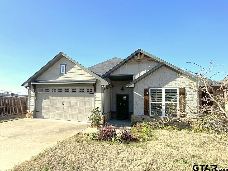 Darling and immaculately maintained Craftsman Style home located near UT Tyler, TJC, shopping & dining. You can't beat the location of this quality built and lovely appointed home. High ceilings throughout, large open rooms, closets with pocket door and a very smart floor plan give this smaller home a much larger and open feeling. Split plan with master suite and laundry on the same side. The master closet conveniently flows from the master bath into the laundry room. The laundry room opens into the spacious 2-car garage. Nice sized guest rooms with spacious closets. Both bathrooms have granite vanities and shower/tub combo. The large family room/ living area has cathedral ceiling with exposed beams. Family room flows into the beautiful kitchen. Kitchen includes quality custom cabinetry and hardware, granite countertops, island with bar seating, stainless steel appliances and stylish pendant lighting, large pantry and eat-in kitchen area. Covered patio in back. Smaller fenced back yard with sprinkler system makes for easy living. You can walk to shop! This one will NOT last!
