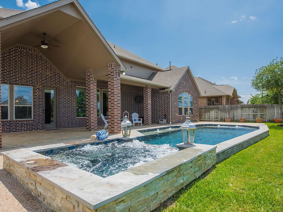 This well-appointed 5-bedrooms, 3.5-bathrooms Home offers a peaceful Water View and a Heated Saltwater Pool with Spa. The spacious Kitchen features ample cabinetry, a gas cooktop, and a large granite island, opening to a generous Living Room with high ceiling, a fireplace and expansive view on the pool . The ground floor includes a Study with French doors and hardwood flooring, a formal Dining Room, as well as a Primary Suite overlooking the pool, complete with a large Bathroom, soaking tub, shower, numerous cabinets and walk-in closet. Upstairs you'll find four sizable Bedrooms, two full Bathrooms, an expansive Game Room with pool table, and a Media Room with tiered theater seating. The covered back Patio along the pool is an ideal spot for your morning coffee! Located within walking distance of Jensk Elementary. REFRIGERATOR WASHER AND DRYER ALL INCLUDED. Minimum Lease of 12 months with options up to 36 months. MONTHLY RENT INCLUDES POOL/YARD/PEST CONTROL MAINTENANCE.