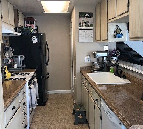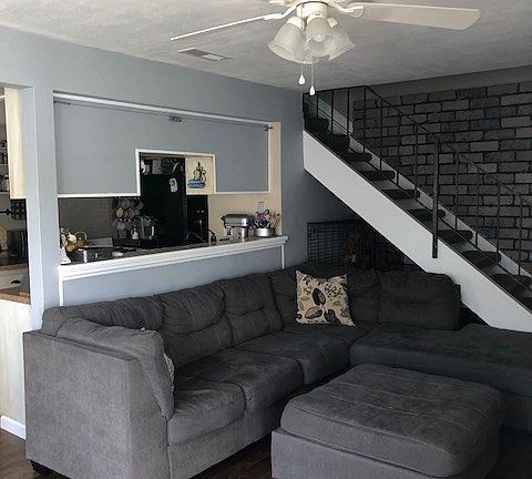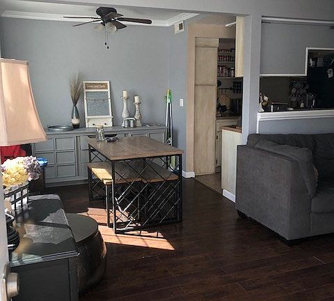 Just the right touch of style! This charming home features newer windows, doors and hardware and has neutral decor with rich looking laminate wood flooring. Downstairs you'll find the comfortable living room with a ceiling fan and built in shelving for your media choices. Dining area is off the living room and kitchen with another ceiling fan. Kitchen features off white cabinetry, upgraded counter tops, large sink, plus a pass thru window to the living room. Both bedrooms are upstairs. Nice large white vanity in bathroom and custom mirror. Patio area outside to suit your needs. 2 parking spaces - one in open garage and one uncovered.