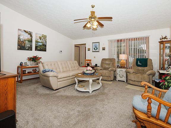 The fabulous covered front porch welcomes you inside this inviting ranch-style home featuring a bright, open layout with vaulted ceilings in the living room and kitchen, creating a spacious and airy feel. The main floor offers convenient laundry--a rare find in a ranch plan in this subdivision. There is newer carpet throughout, and plenty of natural light. The kitchen has an extra set of cabinets along the eating area flowing seamlessly to the living room, perfect for both relaxing and entertaining. There is a slider from the kitchen providing easy access to the cozy patio and backyard. There are 3 bedrooms, and two full baths, including the owner's suite. Downstairs, you'll find a partially finished basement with additional living space, ideal for watching movies, a home office, or workout area. There is also lots of unfinished space for storage or future room to finish. The home includes an oversized two-car attached garage with room for tools or extra work space. This comfortable, well-maintained home combines the ease of single-level living with functional updates and a warm, welcoming atmosphere. Roof approximately 2013, water heater 2015, HVAC approximately 2015.