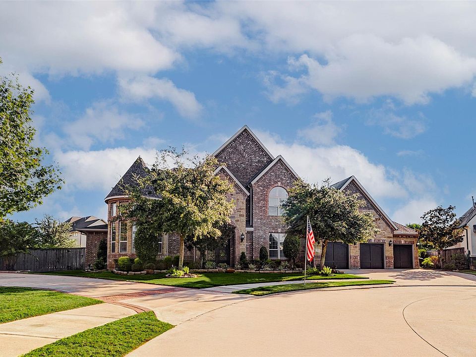This exquisite estate combines timeless elegance with modern comfort, set within a prestigious gated community. Nestled on an oversized cul-de-sac lot, the home makes a striking impression with its stone and brick elevation, frosted glass and iron front door, and dramatic double-staircase entry. Inside, soaring ceilings, custom millwork, wood floors, and plantation shutters create a refined atmosphere. Gourmet kitchen boasts a large island with pendant lighting, abundant cabinetry, and premium Jenn-Air appliances, opening to a spacious family room with a gas fireplace. A handsome study with French doors, chandelier, and two-story windows complements the elegant formal dining room. The expansive primary suite features a spa-like bath with soaking tub, “carwash” shower, and generous walk-in closet. Outdoor living is unmatched with a covered patio, full kitchen, and sparkling pool. Residents enjoy access to community pools, parks, trails, tennis, lakes, and the Golf Club.