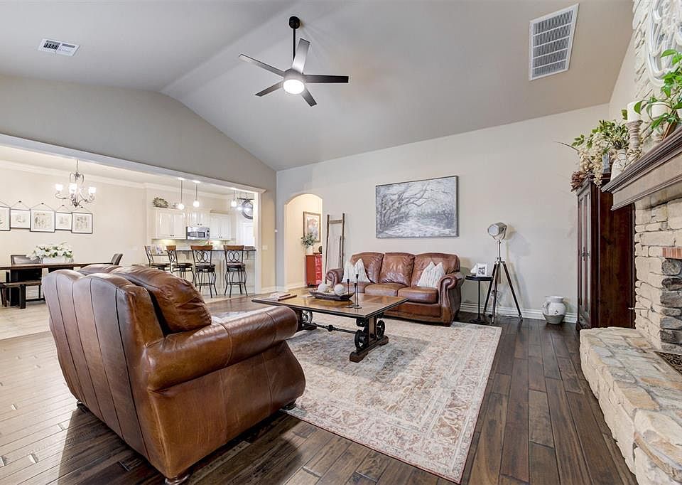 Stunning home on huge corner lot, directly across from greenbelt, popular paved walking trails and community pond sits just down the street, visible from front porch. Welcome to 2803 Hidden Prairie Way, offering 2557 sq feet of living space and a three car garage. Conveniently located on 33rd street between Kelly and Santa Fe in Edmond, OK. Offering 3 bedroom and 2.5 bathrooms, this home also has a flex room that can be used as a home theater has mount ready for your flat screen with a adjacent office this space could easily convert to 4th bedroom. The open concept kitchen and dining room open into beautiful vaulted ceiling living room with gorgeous floor to ceiling rock fireplace. Outdoor space offers large covered gathering area with roll down sun screen and as a bonus the patio furniture stays with home. The floor plan offers a very private primary suite, with a large bathroom boasts an oversized soaking tub & very spacious walk-in closet that connects to utility room with washer and dryer included. 2 Guest rooms are connected by a shared bathroom with each room offering individual vanities and storage that share a large walk in accessible shower. Additional features include 3-car garage w/ storm shelter, beautiful wood work and finishes throughout, did we mention how great the walking trails are? Property has updated landscaping and full watering system. This is a great neighborhood conveniently located in West Edmond giving access to near endless shopping and dining opportunities. Easy connection to the Broadway extension offers great access to downtown Oklahoma City. Home comes with washer, dryer, fridge, patio furniture and bar stools. Schedule your private tour today and make this move-in ready home yours!