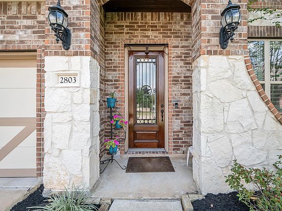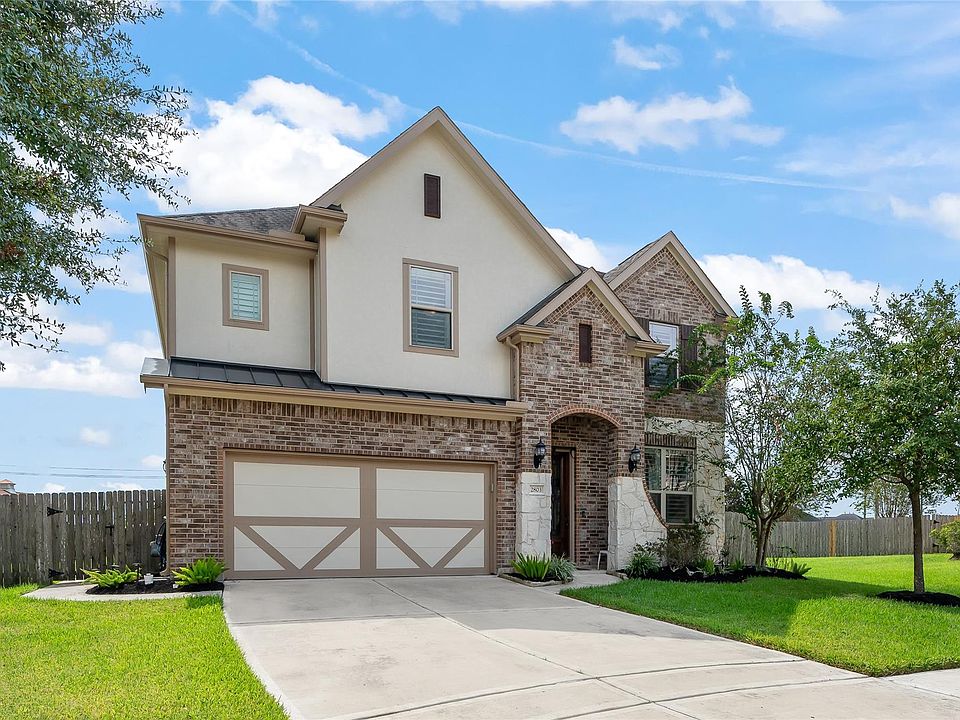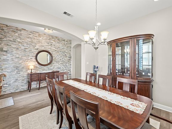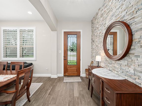 Stunning 5-bedroom, 3.5-bath home brimming with upgrades and timeless design. Inside, wood floors, plantation shutters, recessed lighting, and ceiling fans complement a dramatic two-story stone gas fireplace with convenient floor plugs. The chef’s kitchen impresses with stainless steel appliances, convection microwave, built-in range, under-cabinet lighting, and a hands-free faucet. Retreat to the primary suite with a sitting area, dual walk-in closets, soaking tub, walk-in shower with body jets, and a heated towel rack. Smart features include a tankless water heater, whole-house filtration, water softener, and epoxy garage flooring. Outdoor living shines with a large covered patio, arbor lighting, full kitchen with grill, sink, refrigerator, and fireplace, plus a 10x12 powered workshop. Brick accents wrap the exterior, creating curb appeal that blends elegance, efficiency, and resort-style comfort.