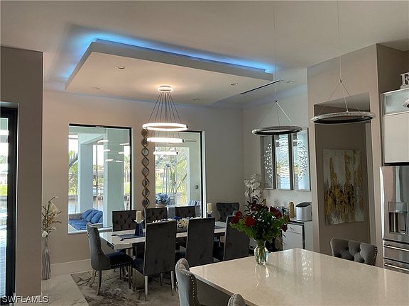 GULF ACCESS Beautiful NEW CONSTRUCTION. Start living the dream in this stunning custom built modern, luxury home. No details were overlooked w/high end finishes, starting w/decorative tiled exterior, tile roof & impact windows and doors. Home features split floor plan, owners suite w/walk around shower w/ jets and rain shower head, w/dual vanity and large separate room for he’s and her wardrobe W/ costume built-in. 4 large bedrooms and 3 baths. Spacious kitchen feature, European style custom cabinetry with 10 ft. Long waterfall edge island with the highest quality quartz. Stunning kitchen also includes stainless steel appliances w/ Glass top cooktop,also features Hidden pantry w/ cabinets and sink. Enjoy high ceilings and 10ft. sliders seamlessly integrating indoor/outdoor living spaces. Outdoor living has plenty of Shade under stylish wood ceilings featuring built in summer kitchen and beautiful tile entertainment center with fireplace. Pool has a huge sun shelf perfect for lounging ,cooling off and relaxing, don’t forget about the hot tub overlooking the intersection of the canals. Pictures with the furniture was used from same
