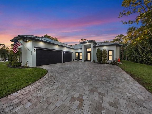 Modern 3 bedroom + den, 3 bath pool home on nearly half an acre in Bonita Springs, just minutes from Barefoot Beach, shopping and dining. A long paver drive and contemporary elevation with metal roof lead into a light-filled open layout with high ceilings and wide-plank tile flooring. Sleek kitchen with oversized waterfall island, flat-panel cabinetry, smart stainless appliances and double wall ovens opens to the living and dining areas; oversized den with private bathroom works well as a media room or your own personal gym. Spa-style primary suite offers a striking bath with patterned tile, floating dual vanities, freestanding soaking tub and large shower. Outside, enjoy a private outdoor oasis with saltwater pool, raised spa, auto-fill/auto-drain system, travertine deck and covered lanai. Spray-foam attic insulation, smart features and generous yard space on all sides complete this move-in ready retreat.