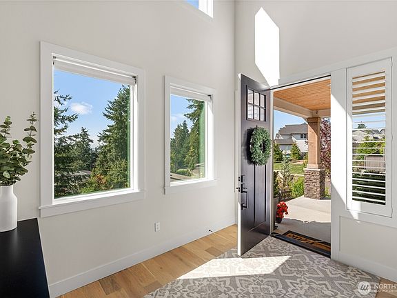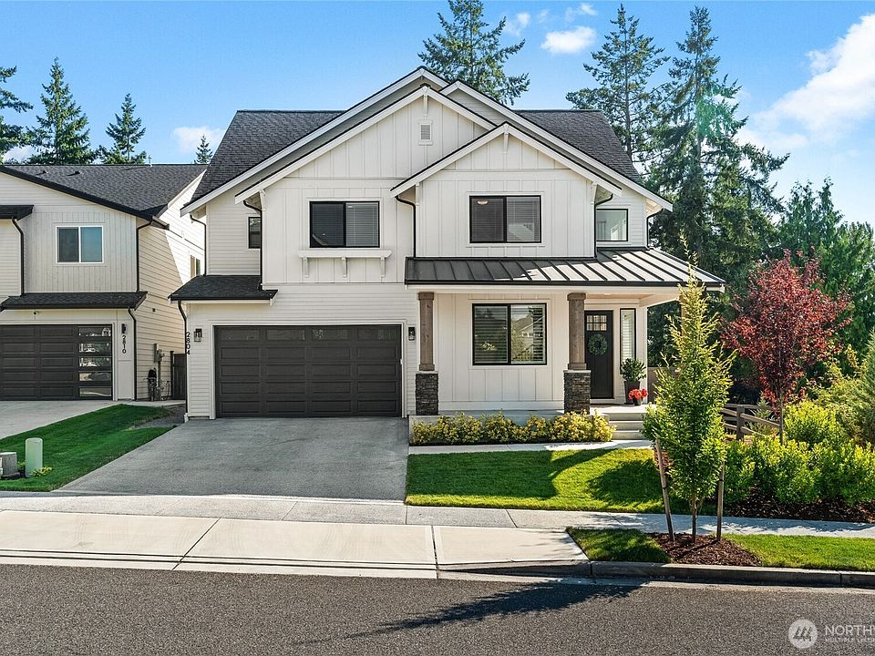 Stunning NW modern farmhouse! This 3-story home blends sleek design with comfortable living & upgraded finishes throughout. The main level offers a spacious guest room/den, ¾ bath, wide-plank flooring, box-beamed ceilings, and a covered deck with fireplace overlooking a beautifully landscaped yard. The chef’s kitchen features quartz countertops, SS appliances, full-height backsplash, bar seating, and a dining area that flows into the great room with gas fireplace and custom built-ins. Upstairs, the luxurious primary suite includes a spa-inspired 5-piece bath, plus 3 more bedrooms and a full bath. The third floor has a large bonus room and ¾ bath—perfect for a media room, gym, or guest retreat. Close to highways, retail, dining, and trails!