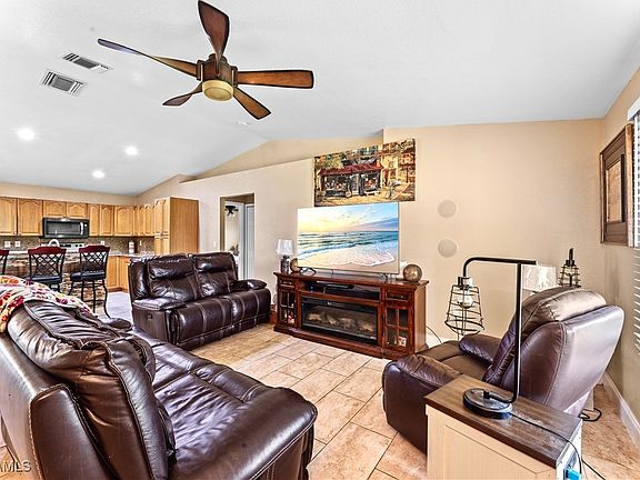Welcome home to this Beautiful 3/2 nestled away on a quiet DEAD END in the highly desirable SW side just minutes to Fort Myers & all major amenities. It has been recently painted & spotlights a (2023) DIMENSIONAL shingle roof, (2019) HVAC system, appealing GRANITE countertops & backsplash with an impressive glass tiled breakfast bar great for entertaining. This open floor plan highlights cathedral ceilings with porcelain tile & wood laminate flooring throughout, spacious countertops with STAINLESS STEEL appliances, a newer water heater, crown molding, and an admirable vanity + mirror & commode in guest bath. It also highlights an oversized back screened patio, a newer water treatment system, premium fixtures, and dual closets with a walk in shower & custom vanity in master. It also features an irrigation system, recessed lighting, Faux blinds, hurricane shutters, and a high efficiency washer & dryer. Schedule your showing today!