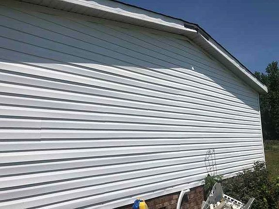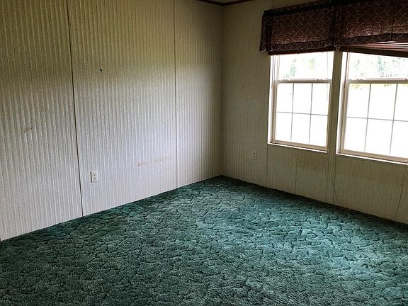 Manufactured home at the end of a dirt road. Home is very dated inside with sculpted carpet. All walls are heavily stained with nicotine. Also fireplace in den. 3 bedrooms and 2 baths.