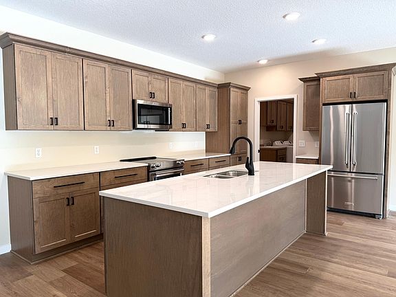 cabinets. The oversized quartz center island is great for dining and entertaining. Adjacent mud room