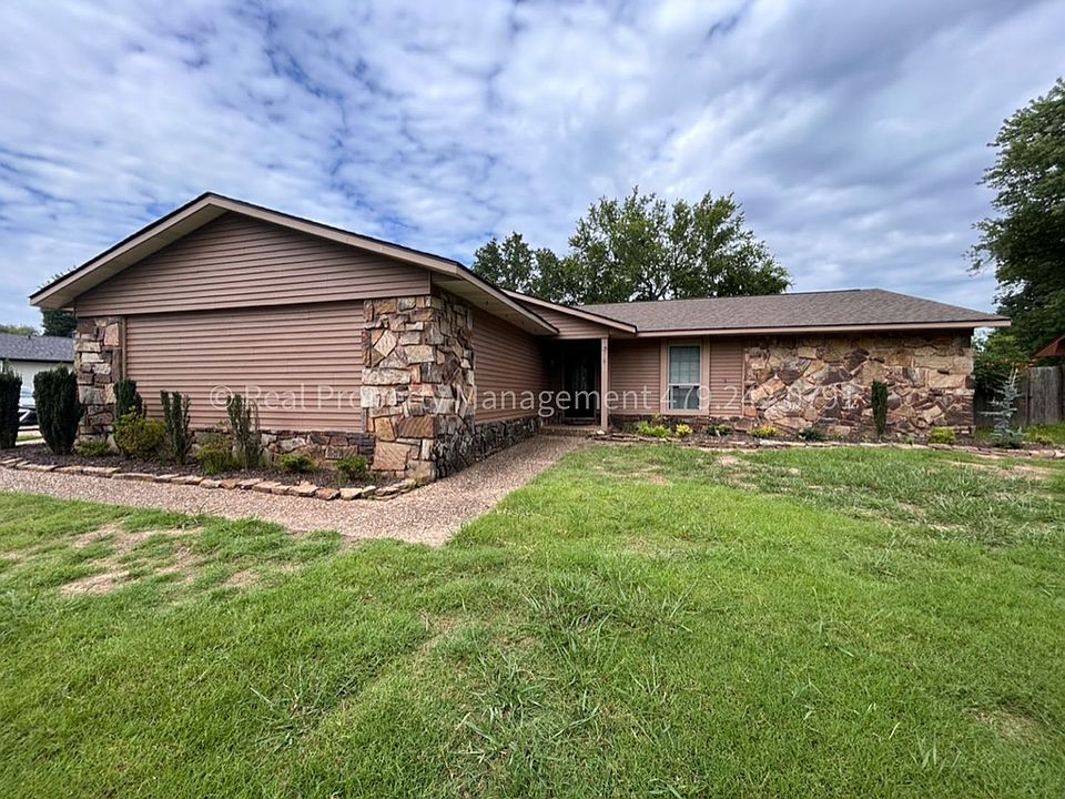 Welcome to this charming 3 bedroom, 2 bathroom home located in Fort Smith, AR. Spacious single family home on the corner of 97th Circle and River Ridge Road. This house features a fully equipped kitchen with a dishwasher, microwave, stove/oven, and refrigerator, all stainless steel. The spacious living room boasts a fireplace, perfect for cozy nights in, and a wet bar. Enjoy meals in the eat-in kitchen or step outside to the covered patio overlooking the privacy fenced backyard. Large closets in all the bedrooms and extra storage closets throughout the house. Formal dining room or office space with built in cabinets. With a 2 car garage, storage building with electrical service, and a large corner lot, this home offers plenty of space for all your needs. Tenant pays water/electric/gas and is responsible for all yard and landscaping maintenance. Pets allowed (2 pet limit - some dog breeds are restricted). NO HUD.