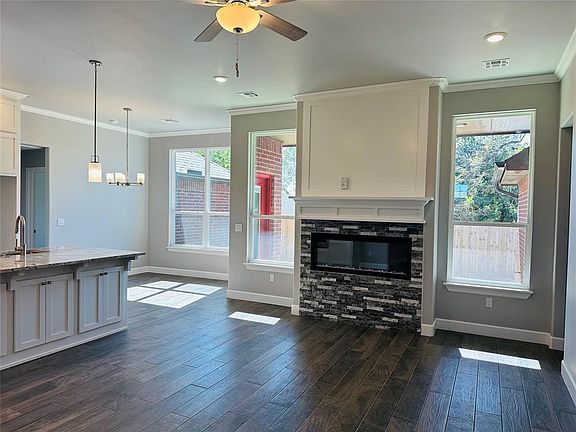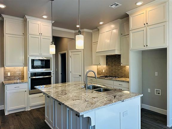The kitchen is equipped with built-in appliances, a vent hood over the cooktop, and stylish finishes that elevate both form and function. Additional features include a covered back patio, 3-car garage, storm shelter, full fence, blinds, and a sprinkler system for convenience and peace of mind.