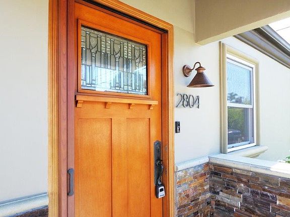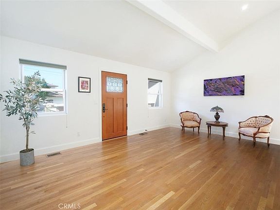 Step into this charming home featuring soaring ceilings and gorgeous hardwood floors throughout. Stay comfortable year-round with air conditioning and Milgard double-pane windows that fill the home with natural light. The updated kitchen is a chef’s dream, boasting granite counters, custom soft-close cabinetry, a pot-filler, and premium appliances including a Bosch dishwasher, LG refrigerator, newer stove, and microwave. Skylights in both the kitchen and bathroom add extra brightness. Dual glass doors open to a private backyard oasis with mature trees, a built-in grill, and a dining area—perfect for California indoor-outdoor living. Bedrooms are appointed with Hunter fans, blackout blinds, and custom closets with beveled glass. The bathroom features an antique vanity, bidet, dual showerheads, and beautiful slate walls with tiled flooring. Additional highlights include cherry wood interior doors, LED lighting throughout, and a garage with washer/dryer hookups, sink, cabinetry, and an automatic roll-up door.