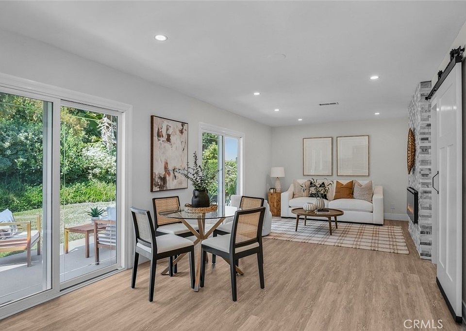The open-concept family room with stacked stone fireplace and kitchen flow effortlessly to a lush, private backyard with a retractable awning—perfect for outdoor entertaining, BBQs, relaxing mornings, and evening gatherings under the stars.