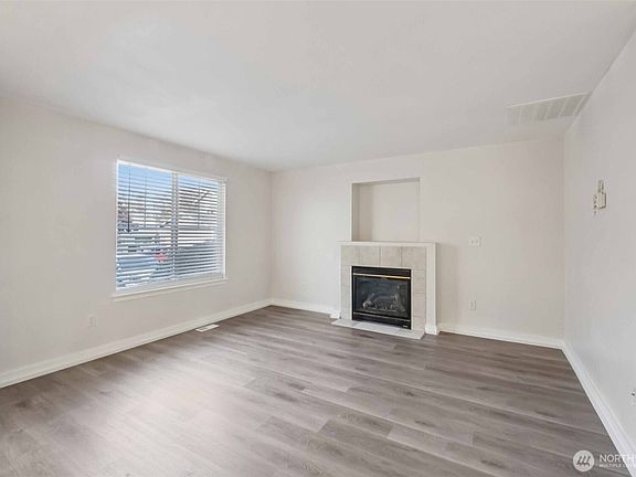 Walk to Bradley Lake and the park! Enjoy the perfect balance of low-maintenance living and outdoor recreation. This 3-bedroom, 2.5-bath home is privately situated at the back of the neighborhood and features an open-concept floor plan with a cozy gas fireplace. The kitchen offers granite slab counters, a pantry, and a dining area. Main-level primary suite with full bath and walk-in closet, plus convenient half bath and laundry room. Upstairs includes two bedrooms and a full bath. Other features include an energy-efficient gas furnace, white vinyl windows, and a 2-car garage. Corner lot with direct access to Bradley Lake trails and quick connections to Hwy 512, 167, and Pierce College.