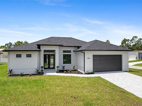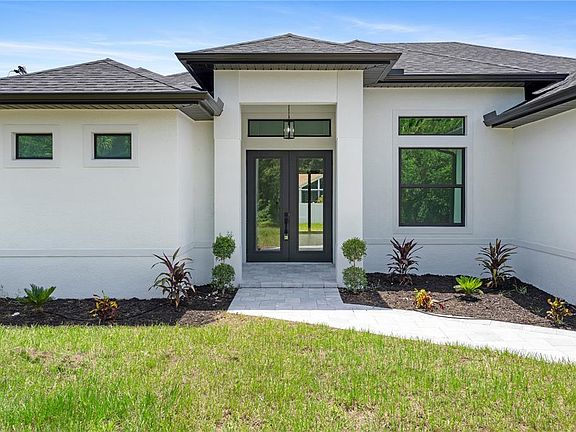 MOVE-IN-READY, NEW CONSTRUCTION. Corner Lot with 3 bedroom, 2 bathroom + office. You're going to love all of the high-end finishes that were chosen with luxury in mind. From paver driveway to ALL IMPACT doors and windows. As you enter the home you're greeted by spacious ceilings and a large triple impact slider that draws your attention to the oversized lanai, featuring a large backyard. You'll love the oversized 10ft island in your beautiful kitchen with upgraded stainless-steel appliances and a closeted pantry for all your culinary needs. Your main bedroom features high ceilings and walk-in closet with a master bath featuring double showers with glass and two modern vanities. Of course, we have to mention the upgrades that make this home unique: upgraded appliances package, expanded hall ways, tray ceilings, plumbing for outdoor kitchen, recessed A/C unit in garage, extended garage to fit any size car / truck, glass doors in den, and even a Nest thermostat to control climate from your phone!