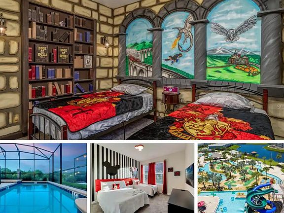 Welcome to 2805 Bookmark Drive, a beautifully furnished 6-bedroom, 5-bath retreat in the heart of the acclaimed Storey Lake Resort. Designed for both comfort and style, this luxury home offers the perfect balance of relaxation, entertainment, and convenience just minutes from Disney and Orlando’s best attractions. Step inside to find a bright, open floor plan with elegant finishes throughout. The modern kitchen features quartz countertops, stainless steel appliances, and a spacious island that is perfect for family meals or hosting guests. The living and dining areas flow naturally toward the private screened patio where you can relax by the sparkling pool and spa with peaceful water views and no rear neighbors. Two primary suites, one upstairs and one downstairs, each feature their own en-suite bath for added comfort. Themed bedrooms bring fun and imagination to life with creative Toy Story and Harry Potter designs that kids and adults alike will love. The upstairs layout also includes three additional full bathrooms plus a versatile enclosed loft that serves as the sixth bedroom. Additional highlights include a first-floor laundry room, a game room in the garage, and plenty of space for large groups. Storey Lake Resort’s amenities are among the best, featuring multiple clubhouses with resort-style pools, lazy rivers, fitness centers, tiki bars, water slides, mini golf, and playgrounds. Offered fully furnished and turnkey, this exceptional home is ready for your personal use or as a high-performing short-term rental investment. Experience the best of Kissimmee resort living and make 2805 Bookmark Drive your own piece of Florida paradise.