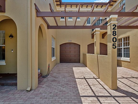 Welcome to 2805 Eagle Rock Circle #1004 -- a wonderful 3-bedroom, 2.5-bathroom townhouse offering over 1,900 sq ft of thoughtfully designed living space in the sought-after, gated community of Ventura Greens at Emerald Dunes.From the moment you step inside, you'll be greeted by high ceilings and an open, airy layout that feels both modern and inviting. The heart of the home -- a beautifully upgraded kitchen -- features granite countertops, a stylish tile backsplash, and stainless steel appliances, flowing seamlessly into the dining area. Just beyond, sliding glass doors invite you to enjoy your private patio-- an ideal space for al fresco dining, morning coffee, or evening gatherings, with pavers perfectly set for your outdoor furniture and grill.Upstairs, the spacious primary suite offers a true retreat, complete with two oversized walk-in closets one creatively converted into a home office and a spa-inspired en-suite bath with a separate shower and soaking tub. Two additional generously sized bedrooms and an upgraded guest bath provide plenty of space for family or visitors, while a convenient upstairs laundry area adds everyday ease. Additional highlights include full hurricane impact windows for peace of mind, motorized shades on the main level, a Nest thermostat for year-round comfort, and an attached 1-car garage. Beyond your front door, Ventura Greens welcomes you with meticulously maintained grounds, a resort-style pool, and scenic walking trails all just minutes from the area's best shopping, dining, entertainment, and major highways.This is more than a home it's a lifestyle. Experience the perfect balance of comfort, style, and convenience your new home is waiting!