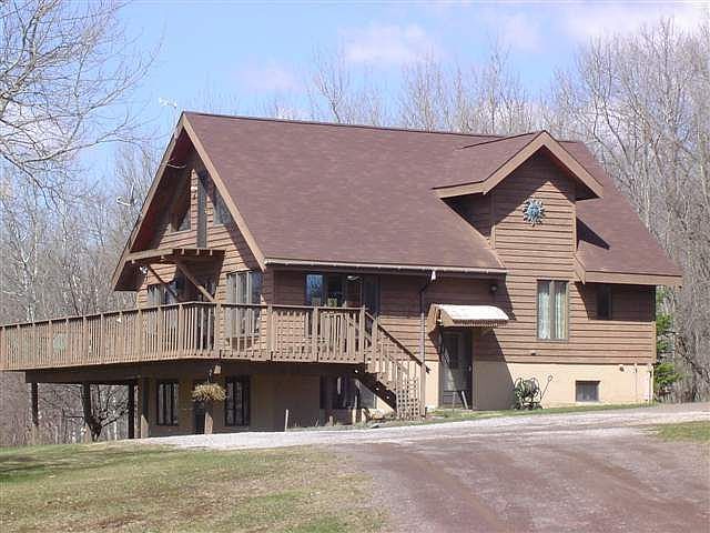 Enjoy the privacy of a 6+ acre wooded property in a convenient location just minutes from the mall, airport, and downtown. Beautiful 2BR cedar sided home with tongue & groove paneling throughout. Open main level floor plan captures wonderful light and is perfect for entertaining. Large kitchen with breakfast bar overlooks the living room/dining combination with free-standing stove. Loft master bedroom with private bath and trapezoid windows. Lower level features a large fam room with walkout that could be divided to create a 3rd BR. Outside there's a wrap-around deck overlooking the yard surrounded by trees. A path leads you to your wildlife pond. 36x28 3 stall garage and 30x36 pole building plus 2 sheds provides plenty of storage