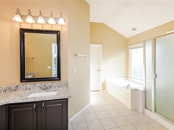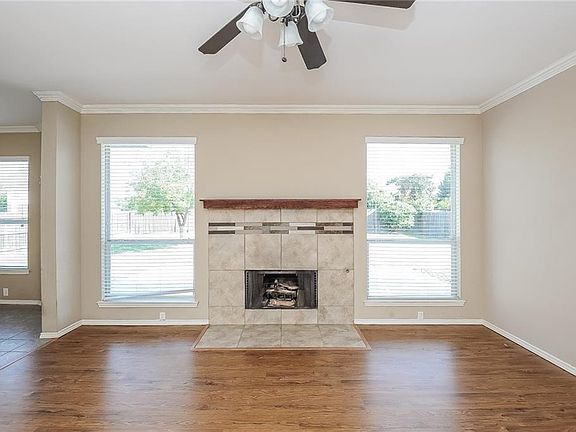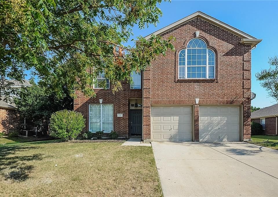This Denton two-story home offers a gas fireplace, stainless steel appliances, granite kitchen countertops, and a two-car garage.