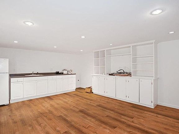 The layout is larger than most basement units and feels like separate "zones" rather than one big room. A long hallway leads to a cozy den/office nook perfect for a desk and sofa setup. The open-concept living and dining area flows into the kitchen and features built-in bookshelves, great for a TV or displaying your favorite things. Bright recessed lighting throughout keeps the space feeling warm and inviting. The bedroom is tucked away from the main living area for added privacy.