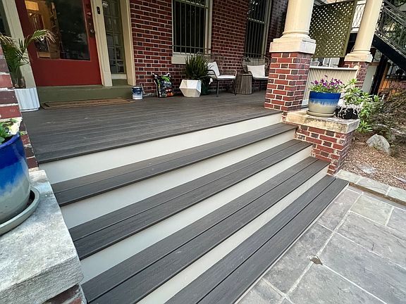 Shared spaces include: Large front porch with lounge chairs, sunroom with exposed brick, big back deck with planters and grill, and a bright living/dining area.