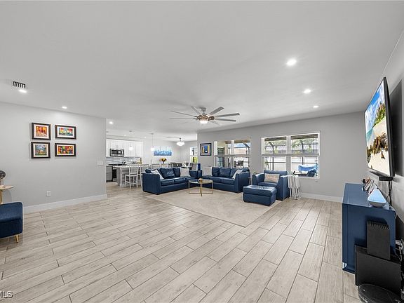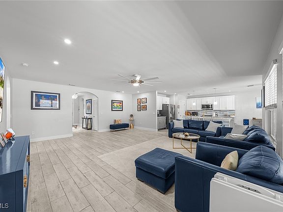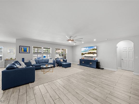 Welcome to this stunning 4 bedroom, 2 bathroom + den single-family pool home offering 2,319 sq. ft. of thoughtfully designed living space. Located in highly desirable SW Cape Coral, this home has never flooded and comes with an assumable flood policy for added peace of mind. Step inside to find new porcelain tile throughout, a modern updated kitchen, and renovated bathrooms that blend style and function. The spacious primary suite features custom California Closets for maximum organization. Enjoy Florida living at its finest with your own private pool and spa, perfect for relaxing or entertaining. The backyard is fully fenced, includes a separate dog run, and offers plenty of privacy. This home also boasts major recent upgrades including a new roof, new fence, and new A/C, new pool pump and appliances ensuring worry-free living. Additional features include a circular driveway with extra space, security system, whole house carbon water filter, city water and sewer with all assessments paid, and a bright, open layout. Don’t miss the opportunity to own a meticulously cared for-move-in ready home in one of Cape Coral’s most sought-after neighborhoods!