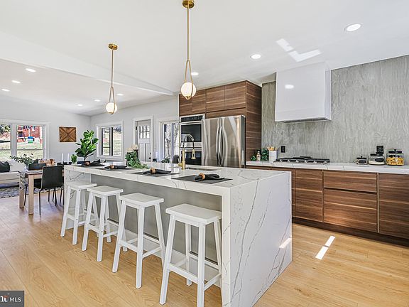 Welcome to a masterfully renovated mid-century ranch that redefines modern luxury living. This stunning property showcases an expansive open-concept design, nestled on a generous .31-acre lot in the prestigious Cheswolde neighborhood. The heart of this home is its spectacular custom kitchen, featuring double-thick 2.5" Calacatta quartz countertops and an oversized waterfall island. The double ovens, dual dishwashers, and 3 sinks make entertaining effortless. The open floor plan creates a versatile space to expand the dining room to fit your needs for gatherings. European modern soft-close cabinetry with integrated hardware complements the sophisticated backsplash and custom range hood. Natural light floods the interior through new windows, highlighting the premium European white oak luxury vinyl plank flooring. The primary bedroom suite offers the ultimate retreat with dual walk-in closets, an elegant fireplace, and a spa-inspired bathroom featuring oversized dual vanities, a luxury soaking tub, and thoughtful touches like LED surround mirrors and towel warmers. The main level sliding doors lead to a newly constructed deck with custom café lighting, overlooking the fully fenced private backyard. The lower level presents three additional bedrooms, each with walk-in closets, plus a substantial recreation room anchored by one of the home's three elegant fireplaces. The sliding door to the rear patio and yard allow for easy flow to the fenced yard. Recent 2024 upgrades include all new plumbing, electrical, water heater, windows, roof, and an expertly poured deep driveway. The covered patio entrance provides a gracious welcome to this thoroughly modernized residence, where every detail has been carefully curated for sophisticated contemporary living.