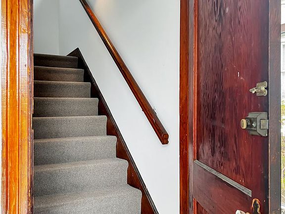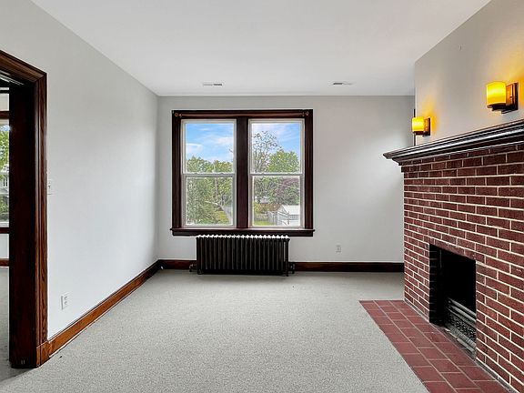 Step inside through a covered front porch into a common area with a vintage 1940s door leading to the upstairs unit. Take the stairs to discover brand new carpet and beautiful dark wood trim throughout. To the left, a quaint bedroom awaitsideal for an office or play area. Straight ahead is the spacious living room which boasts a stunning brick fireplace and expansive windows. Continue through the layout into the formal dining area and then into the well-appointed kitchen. The kitchen features a gas range, stackable washer/dryer, refrigerator, and pantry. A hallway off the kitchen leads to two additional bedrooms and a fully renovated shared bathroom.