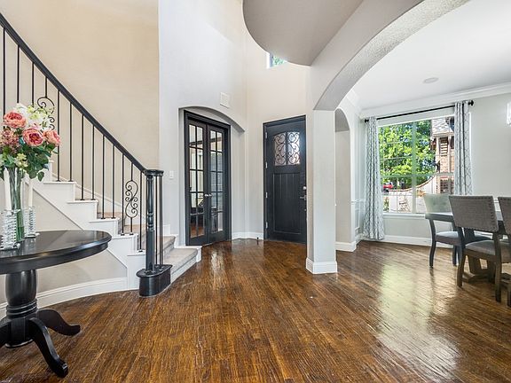 Sparkling poolPrivate backyard oasisHandscraped wood floorsStainless steel appliancesDramatic entrySoaring ceilingsOutdoor fireplace