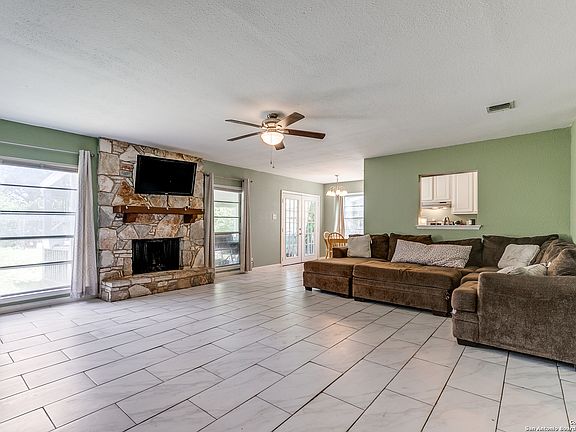 This charming, single-story abode includes warmth and comfort of a stone/rock fireplace in the main living area which can be perfect for those seeking to downsize or start a family. Recently enhanced, the property now boasts a new roof, HVAC system, carpets, ceramic tiles, and elegant granite countertops which complement the sleek undermount sink, upgraded smooth top range, dishwasher, and disposal; all completed in 2021. Additionally, the two bathrooms have been tastefully updated to a higher standard. Unwind in the ample backyard, sheltered under the covered patio, or take advantage of community amenities such as the swimming pool, basketball court, picnic area, playground, and nearby senior center. Conveniently situated for rapid access to Joint Base San Antonio, incorporating Fort Sam Houston and Randolph Air Force Base; both reachable within just a 20-minute drive. Furthermore, FM 78 and IH-35 offer easily accessible shopping and dining options.