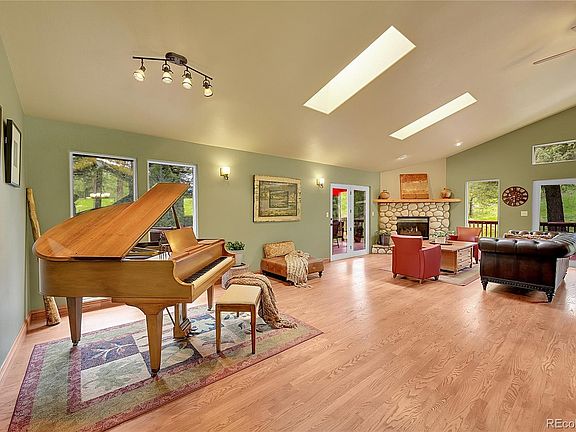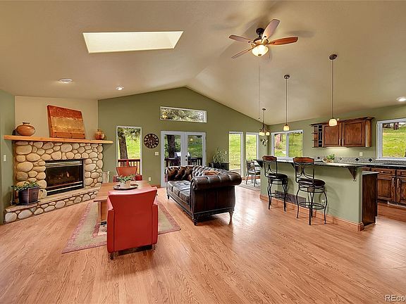 Tucked at the end of a quiet cul-de-sac and backing to 427 acres of Denver Mountain Park, this delightful home offers a rare & wonderful combination of serenity, privacy, & convenience! You can step out of your door & right onto trails, & it’s also walkable to Evergreen Lake, the library & charming downtown Evergreen for shopping, dining, and community events! Set in a pastoral setting frequented by deer & elk, the home features an open vaulted floor plan filled with natural light. Rich hardwood floors flow throughout the main level, complemented by plentiful windows that frame views of the surrounding nature. The spacious kitchen boasts a center island with counter seating, a pantry closet, newer appliances & breakfast nook—ideal for both everyday living and entertaining. The lovely great room offers generous space for both dining & relaxation, complete with a warm, inviting fireplace that anchors the living area beautifully. From both breakfast nook & great room you can step outside to the expansive wraparound deck. Whether it’s morning coffee, or enjoying evening sunsets, you can take in the acres of lush, peaceful open space around you. Heading up a short flight of stairs takes you to the inviting primary suite that includes a bathroom with granite counters, dual sinks, updated shower & walk-in closet. Two bedrooms & lovely full bath complete the upper level. The home offers more space & flexibility with a walk-out lower level including a large family room, another bedroom, a beautifully remodeled bathroom, laundry room & access to the outdoor patio and backyard area. Additional highlights include a practical mud room, an oversized garage with storage cabinets, paved driveway, & public utilities including water, sewer, & natural gas. This home is a true gem - a special opportunity to live in a quiet, peaceful & private setting bordering acres of trails & forest, all just moments from a multitude of amenities. Video & 3D at www.28065CamelHeightsCircle.com