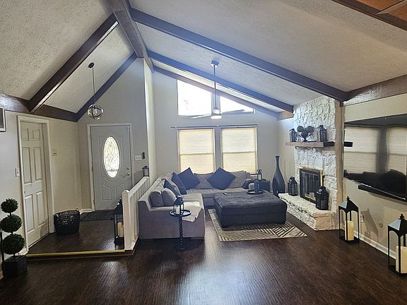 Stunning stone wood-burning fireplaceRich dark laminate flooringOpen living spaceSoaring vaulted ceilingsBright neutral paletteSpacious eat-in kitchen
