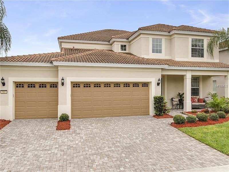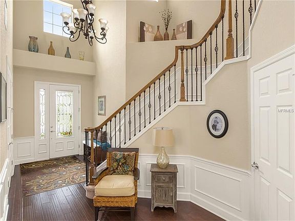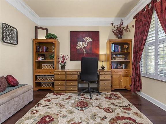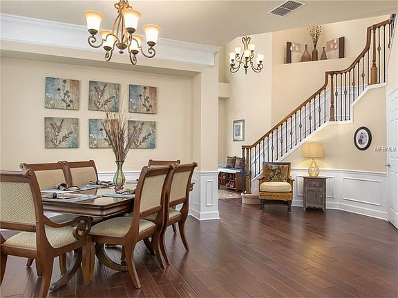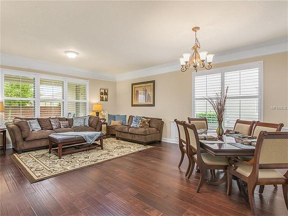 This new Florida transitional design home is highly functional home. Located in gated Meadow Ridge, close to shopping and dining, this home is perfect for true Florida living. The beveled glass and wood entry door and foyer create a refined entry. Opening to the formal dining room the elegant custom hardwood flooring and crown molding further define the arrival experience. The private home office/library is set apart. The lovely hand scraped wood flooring extends to the first floor living areas. The gourmet kitchen is a dream; a working island combines function and beauty with stainless steel appliances, exotic granite, custom cabinetry, backsplash, and a large pantry. The chefs kitchen opens naturally to the casual family areas. The family space transitions naturally to covered porch with massive yard. The oversized master suite is linked to the master bath adorned with modern cabinetry, porcelain tile flooring, soaking tub, large shower and spacious closets complete the retreat. Secondary bedrooms are spacious and all closets are finished. TOP RATED SCHOOL DISTRICT - THORNEBROOKE ELEMENTARY, GOTHA MIDDLE, OLYMPIA HIGH.