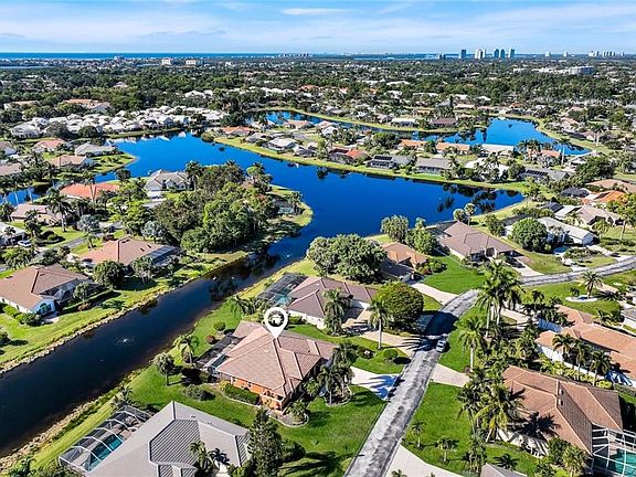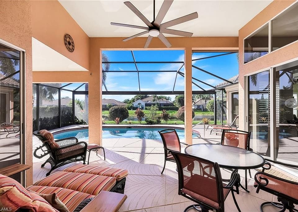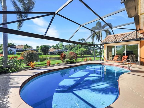 Experience serene lakefront living in this beautifully maintained 3 bedroom/2 bath LAKE FRONT pool home, offering over 2,300 square feet of thoughtfully designed space. Located within the highly sought-after gated community of Vanderbilt Lakes, this home blends comfort, elegance, and an exceptional coastal lifestyle. Improvements include, Pool heater - 2024, Washer/dryer - 2024, Lennox 20 Seer High Efficiency A/C and Heater- 2021, Water heater - 2021, Impact glass windows - 2019, Storm Smart Storm Screens - 2019, Panoramic view pool cage - 2019, Roof - 2018. Just minutes from pristine Gulf beaches, premier shopping, and an array of dining options, the home also benefits from an inland location that the owner notes has historically provided strong protection during hurricane seasons—an ideal combination of convenience and peace of mind. As you step through the front door, you are immediately greeted by an expansive lake view that serves as the breathtaking focal point of the home. The formal living room, enhanced by vaulted ceilings and abundant natural light, sets an elegant tone and flows seamlessly into the sophisticated formal dining area—perfect for hosting memorable gatherings. To the right, the home opens into a spacious, well-designed kitchen overlooking a warm and inviting family room/den and an informal dining space, creating an ideal hub for everyday living, relaxing, and entertaining. Thoughtfully designed for privacy, the primary suite is tucked away on one side of the home, offering a peaceful retreat separate from the main living areas. On the opposite side, the guest wing provides an equally well-planned layout, featuring two generously sized bedrooms and a full guest bathroom. This private placement ensures comfort and convenience for family or visiting guests. Large sliding glass doors from the great room, formal living area, and primary suite open onto a generous screened pool area, creating an exceptional indoor–outdoor flow. Whether you’re hosting guests or enjoying a quiet evening at home, the west-facing orientation provides breathtaking sunset views over the water—turning every evening into a spectacular display. Surrounding the home, beautifully maintained and lush landscaping enhances curb appeal and creates a serene backdrop both outdoors and from every window. The meticulous plantings and mature greenery complement the lakefront setting, adding to the home’s inviting and tranquil character. Situated on one of the most desirable and picturesque streets in the neighborhood, this property offers a rare opportunity to enjoy privacy, natural beauty, and refined coastal living in one of the area’s premier communities.