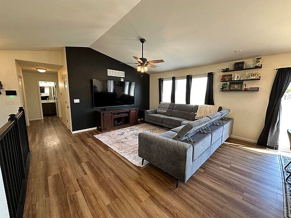 Adjacent dining spaceAttached bathroomOpen concept livingSliding glass doorAttached two car garageCathedral ceilingsLarge walk-in closet