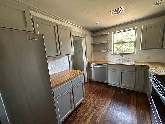 Inside, original wood floors lead you through a sun-drenched, open-concept layout. The kitchen is a true standout, with its crisp white subway tile, butcher block countertops, and new stainless steel GE appliances ready for your next culinary creation. The living room provides a cozy focal point with its elegant mock fireplace and built-in shelving, perfect for displaying your prized possessions.