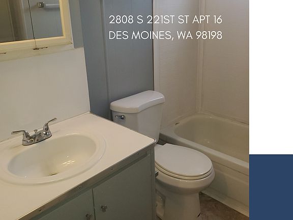 AVAILABLE NOW. READY TO MOVE IN. Newly remodeled. This is a corner, studio unit with a private bathroom and a kitchenette on a ground floor with a few steps to the door. This is a safe, quiet community with an on-site manager. Property Location: 2808 S 221st St APT 16, Des Moines, WA 98198 Near HYW 99. I-5, shopping, bus line, Seatac Airport, Federal Way, Kent, and next to the Midway park. Rent: $960.00 1 year lease only. (other terms maybe available) Security Deposit: $900.00 (Refundable except $250) $68.00 application fee (non-refundable) per adult applicant Garbage and 1 car uncovered parking included. We bill water and sewer each month. *Income requirement: Minimum $3,000. per month. *Must bring proof of income (pay stubs) *No recent evictions and/or large rental collections and/or no felonies. *We DON'T have washer/dryer. No on-site laundry available. Showing by Appointment Only. Photos and video feature a comparable unit. Sorry, NO PETS. No smokers please. One year lease or inquire us about other options