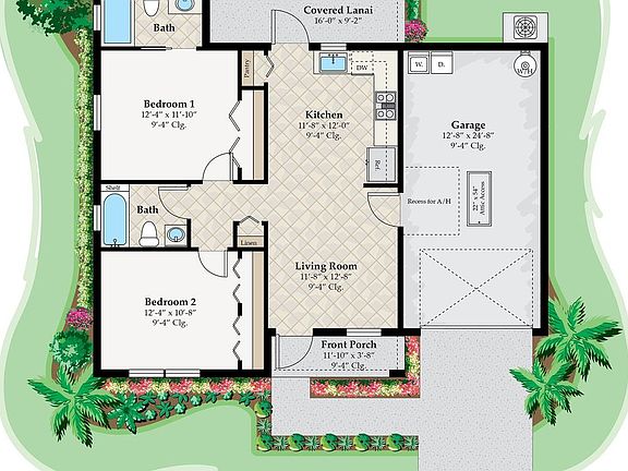 Granite countersOpen front porchPrivate settingLarge quarter-acre lotWood shaker cabinetsCeramic tile floorsCovered rear lanai