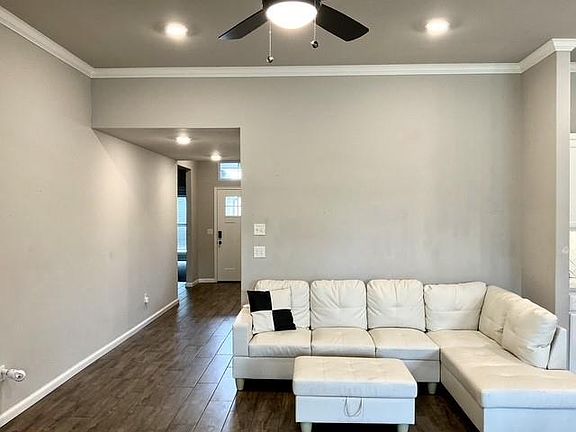 Inside, the open-concept living room connects to the kitchen and dining area, creating a warm and welcoming atmosphere. Durable wood-look tile extends through the main living spaces for a stylish touch.