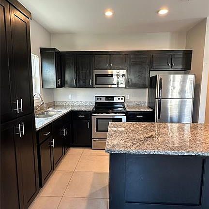 Private patioStainless-steel appliancesTile flooringGranite countertopsWasher and dryerHigh vaulted ceilingsCustom cabinetry