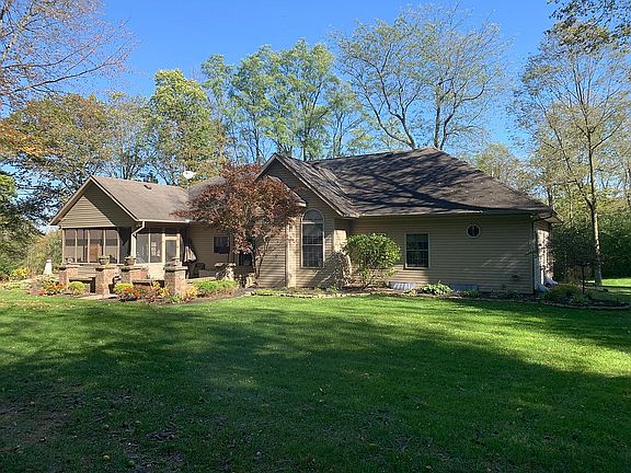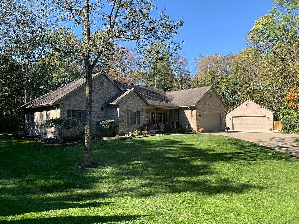 Beautiful ranch home on a 2 acre lot. Mostly wooded. 3 bedroom, 3 1/2 baths, enclosed porch (18x12) and a 2 car attached garage. Home has oak trim and solid wood doors. Finished basement has a kitchen equipped with refrigerator, oven range and dishwasher. New additional 2 car detached garage built in 2020 (24x30). New heat pump in 2019. Under ground dog fence. Home also wired for generator. All kitchen appliances convey with the property.