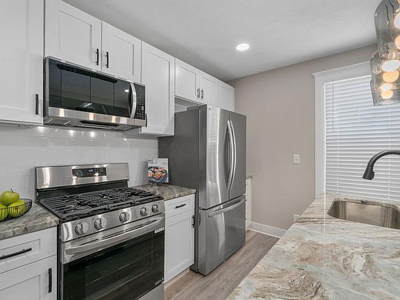 Beautifully updated 2-story home with so many updates! Recently renovated kitchen featuring stainless steel appliances with gas range, granite countertops, & new white shaker cabinets. First floor boasts a rare entry level bedroom, full bathroom with new vanity, tiled shower & new fixtures; dining room, first floor laundry, & huge ATTACHED garage with enough space to store multiple vehicles, or a workshop or hobby space--the possibilities are endless. Just outside the garage is an attached fenced backyard! New flooring & paint throughout, creating a vibrant, welcoming atmosphere. Second floor has a second bedroom and a large, beautifully updated full bath. Located south of Merion Village, offering a convenient location near the charming neighborhood of German Village & Downtown Columbus!