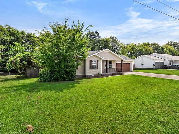 NO HOA OR BACKYARD NEIGHBORS! This well-maintained Ranch Style Home was professionally painted (int.) in July 2024. Relax and Recline in the spacious living room with bay-window and platform to elevate your entertainment center! Run your SS appliances all while doing laundry with the Samsung Washer and Dryer that convey! Did you notice the refrigerator with built in water filter and water pitcher? Pay attention to the unique light fixtures/water faucets throughout the home! Flooring is the same with NO CARPET (except in one closet)! Along with many other unique features here, the Primary Bathroom has Vessel Sinks and Soapstone Countertop! Enjoy yourself on the covered front porch, back deck, or firepit. Take in the SPACIOUS backyard that is fully fenced with trees on the other side for additional privacy!! Very little traffic at this location, as this home is located on a dead end street close to the cul-de-sac. Regarding location-just minutes away to I-24, Ft Campbell, and Clarksville