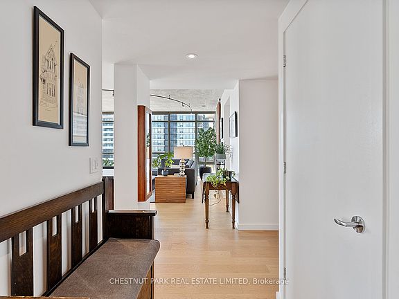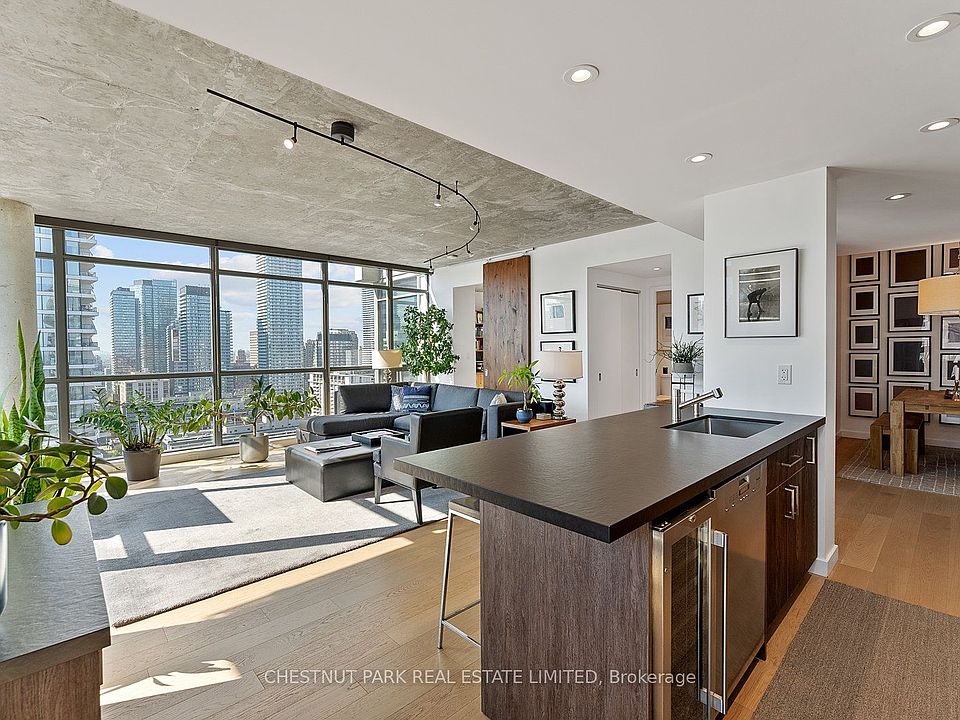 Set in the heart of the village, this 2+1 bedroom, 2 bathroom, 1,184-square-foot suite is waiting for you! As you step inside this rare layout, it instantly feels like home with its warm, earth-tone vibes. The open-concept kitchen and living area are basked in natural light with floor-to-ceiling (9') windows pulling the sunshine in all day long. At night, you are immersed in the city lights, with an incredible southwest view. The kitchen has been done with thoughtful custom cabinetry, high-end appliances with a gas range, and Dekton countertops, complemented with a textured ceramic backsplash. Extend the cooking to the outdoors with a gas line hook-up for the BBQ, while you take in the east view of Allen Gardens. Back inside, the den makes for a perfect dining room with a custom built-in bar, further adding to the great hosting experience this condo has to offer. Enjoy heated white oak flooring throughout, further adding to the comfort and coziness of this soft, loft-like condo with exposed concrete ceilings. The primary bedroom has south exposure with individual heat control, and a 3-piece ensuite, while the second bedroom has south and west exposure, a large closet, and a custom built-in Murphy bed and cabinets. The suite comes with parking and a locker, and has access to the condo gym, visitor parking, party room, and 24-hour concierge. Steps from the old Maple Leaf Gardens, home to TMU Athletic Centre and Loblaws, the Village, and a short walk to Yonge and Dundas, St. Lawrence Market, or Yorkville. Don't miss this rare gem!