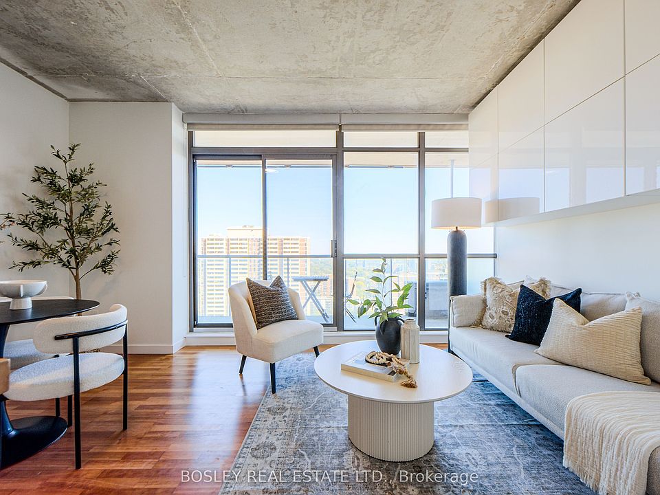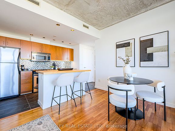 Impeccably maintained 1-bedroom corner suite at the award-winning Radio City Condominiums, offering 556 sq ft of smartly designed living with no wasted space. This bright and airy home boasts soaring 9' ceilings, floor-to-ceiling northeast-facing windows, and a spacious open balcony (96 sq ft) showcasing panoramic city views. The open-concept layout features a modern kitchen, generous living area, and thoughtful updates throughout - perfect for both everyday living and entertaining. Radio City has undergone several tasteful updates over the years, including a stunning new lobby, updated hallways and elevators, a well-equipped and bright weight room and adjacent cardio room, modern party/meeting room, landscaped entrance, and two lush courtyards. Residents benefit from 24-hour concierge service, year-round heating and cooling, bike storage, and a welcoming, pet-friendly community. Ideally located in the heart of downtown, this suite unmatched convenience with the TTC, Loblaws, Church Street, and a vibrant array of dining, shopping, and entertainment all just steps away. One underground parking space is included, making this a truly exceptional opportunity to own a piece of downtown living at its best.