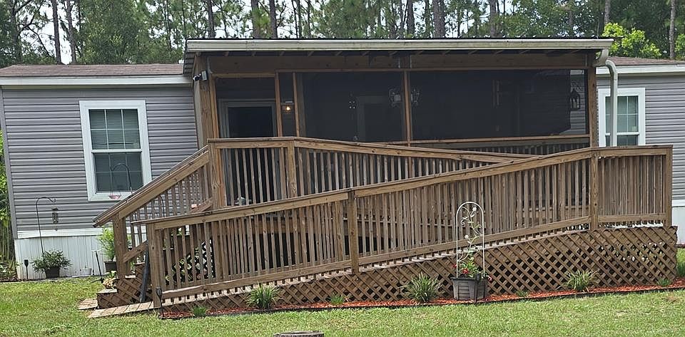 Country Living within walking distance to the Suwannee River with a park and boat launch. This 4.51 Acres is fully fenced in and gated for privacy with a secluded 3/2 manufactured home and no HOA or restrictions. Bring your pets or live stock if you desire. This property has an additional RV hook up that is connected to water, power and septic with a concrete pad. The front porch was built in 2024 and is completely screened in. Additional water supply lines have been added around the property to provide several high volume water output points. There are three storage sheds, a carport for 2 vehicles and a large pavilion. The home and structures are not in a flood zone. Located in Old Town, Florida and 25 miles from the Gulf of America.