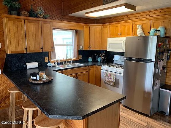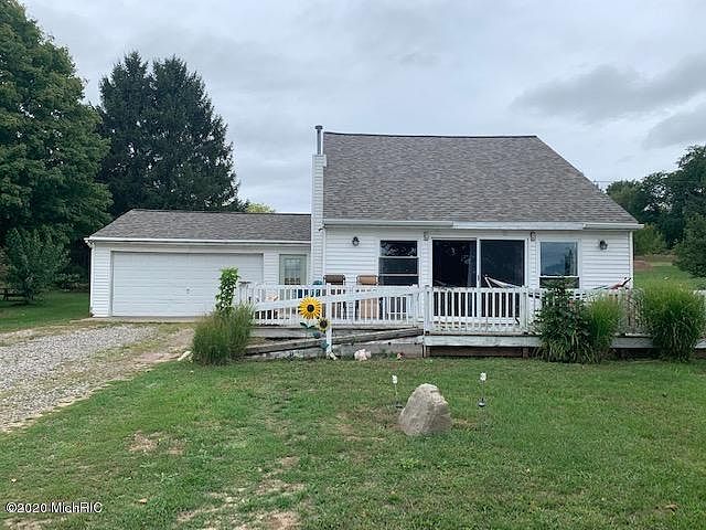 Cute and comfortable 3 bedroom 1.5 bath Saltbox style home in quiet Village of Trufant. Home is situated across the street from Muskellunge Lake-great all sports and fishing lake, with deeded lakefront access lot with docks available. Great room has warm wooded feeling with vaulted ceiling. Beautiful U shaped kitchen with snack bar seating. Main Floor Utility room and washer Dryer included. Oversized attached 2 stall garage with drive thru doors for boats or toys. New roof and front wraparound deck for summer enjoyment. Call for viewing today
