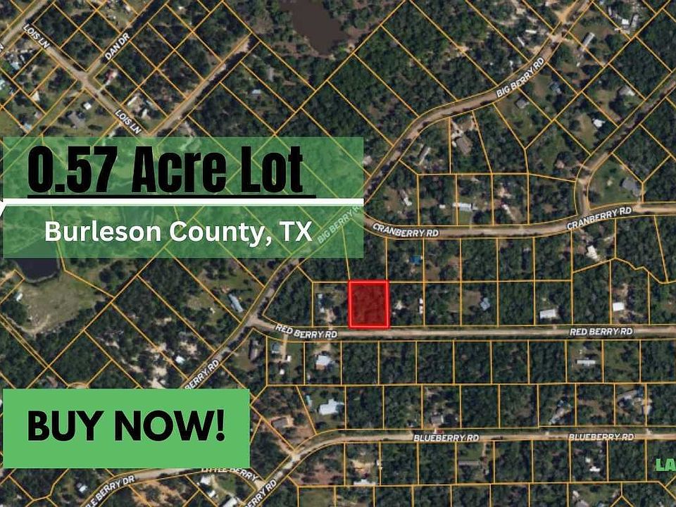 This 0.57-acre residential parcel in Burleson County, Texas, is located in the peaceful Enchanted Oaks Park subdivision and features level topography with mixed forest coverage, offering potential for residential or recreational use. Conveniently situated near Lake Somerville State Park (3 miles), it also provides direct access to unpaved Redberry Road. Buyer to verify all information and conduct their own due diligence prior to purchase; seller makes no guarantees on land use.